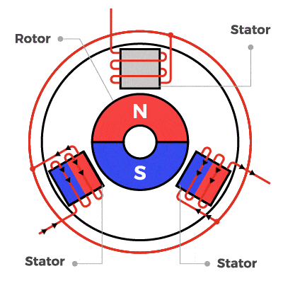 로터는 회전하는 구조물입니다. 영구자석이 부착되어 있고, 스테이터가 만들어낸 자기장을 따라 가장 에너지가 낮은 방향으로 끌려가며 회전합니다.