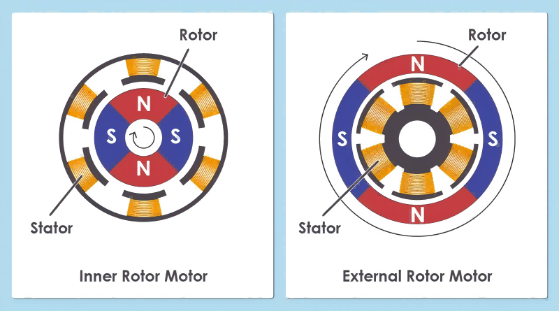 여기서 로터를 스테이터에 바깥쪽에 두느냐, 안쪽에 두느냐에 따라 모터의 종류가 나뉩니다.