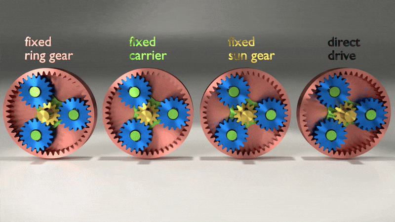 이 구성에서의 감속비는 다음과 같이 정해집니다. \(\text{Gear Ratio} = \frac{\omega_{in}}{\omega_{out}} = 1 + \frac{N_r}{N_s}\)